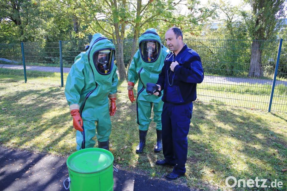 Eine neue Variante der Übung hatte sich das Team des Fachbereiches Gefahrgut ausgedacht. Nach einer stärkenden Brotzeit rüsteten sich die Lehrgangsteilnehmer mit einem Atemschutzgerät aus und sprangen in einen Schutzanzug. Dabei wurde ihnen von den Ausbildern geholfen. An insgesamt vier Stationen mussten verschiedene Messaufgaben erfüllt werden. In einer Station musste ein Bereich erkundet werden, ob sich dort Gefahrenstoffe befinden.