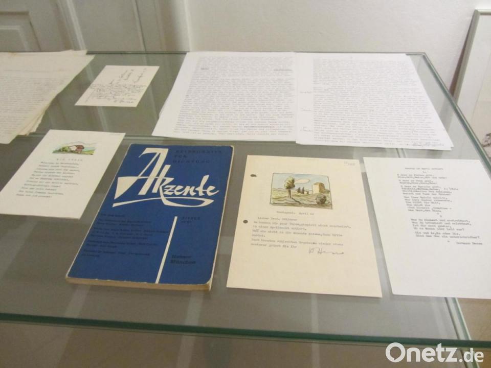 Zur zusätzlichen Bereicherung der Sonderschau förderten die Gastgeber Patricia Preuß und Michael Peter Hehl einige Originale aus dem Hausarchiv zutage, die sich thematisch an die Ausstellung anschließen: Von Hesse eigens mit Aquarellen dekorierte Textbeiträge für Walter Höllerers und Hans Benders Zeitschrift "Akzente" sind ebenso zu bestaunen wie Höllerers Manuskript zur Verleihung des Nordgau-Preises 1994, in dem er in einer Passage auch seinen Besuch bei Hermann Hesse und Thomas Mann memoriert.