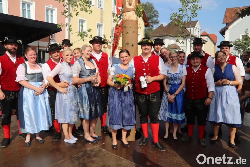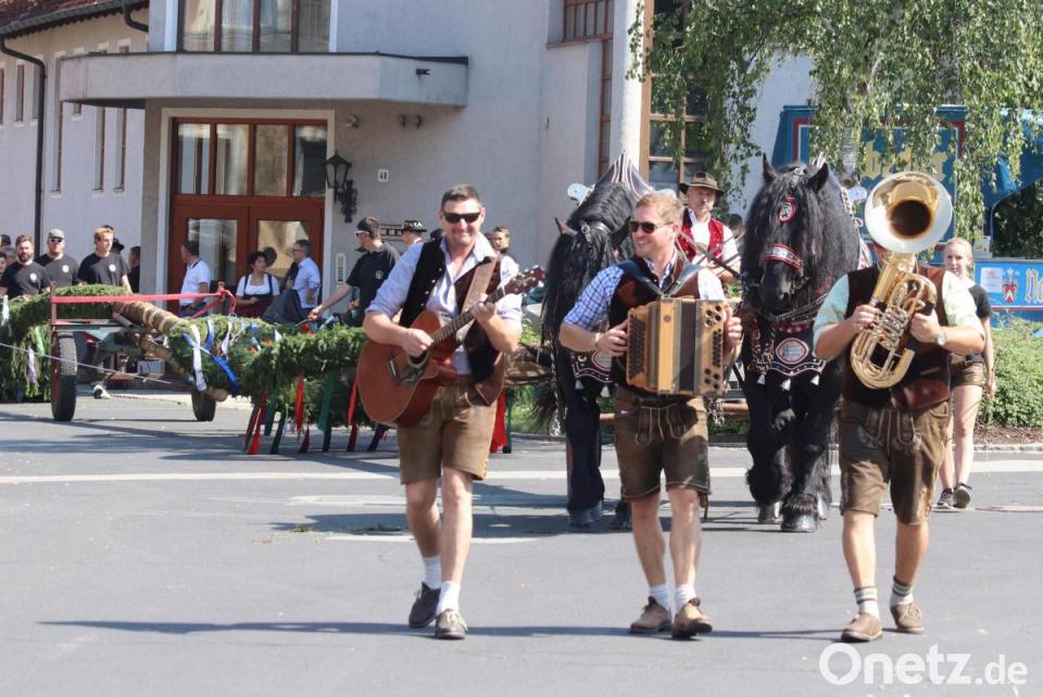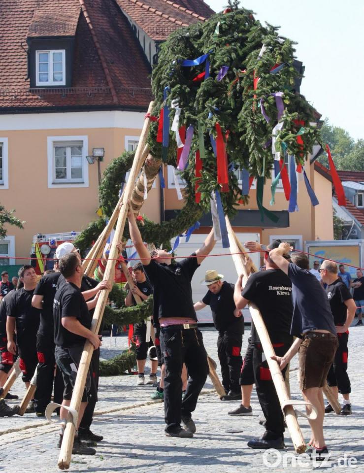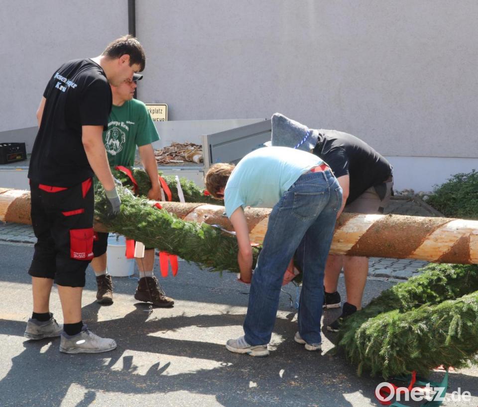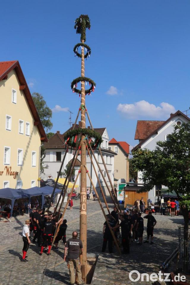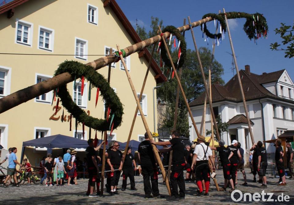 Am Samstag in der Früh wird der Baum eingeholt. Stolze 29 Meter hat er dieses Jahr. Die Nutzung des Geländes am Kettelerhaus ist nach dem Umbau nicht mehr möglich, so wird er im Schatten des Feuerwehrhauses hergerichtet. Begleitet von der Musik der Hoglbouchan ziehen zwei Pferde mit prunkvollem Geschirr den geschmückten Baum zum Dorfplatz. Christian Weiss hat das Oberkommando beim Aufstellen des rund eine Tonne schweren Baumes. Faszinierend zu sehen, wie der Baum mit den Schwalben immer schräger gestellt wird und nach rund eineinhalb Stunden senkrecht steht. Dann noch schnell das Podest um den Baum, Biertische und Bänke platziert und kurze Zeit später sind an diesem lauen Abend alle Sitzplätze belegt. Auch im Fischergarten und bei der Feuerwehr geht's rund, am Dorfplatz mit der Partyband Jack Point.
