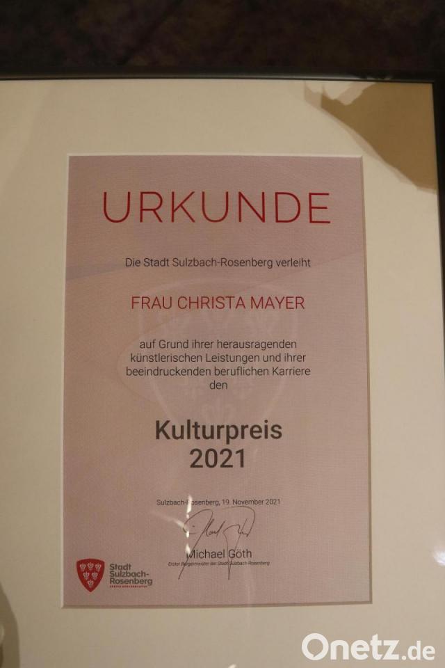 Wie Christa Mayer weiter sagte, fühle sie sich besonders geehrt, diesen Preis zu erhalten, führe sie doch ihre Kunst meistens anderswo aus. Ihre Heimat, ihre Grundsteine aus Sulzbach nehme sie überall hin mit. Diese Verbundenheit verdeutlichte sie mit einer Textzeile aus einem Lied von Franz Schubert: „Glücklich, wer, wohin er geht, doch auf der Heimat Boden steht.“
