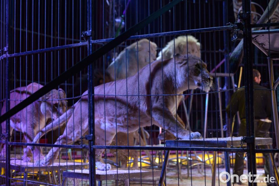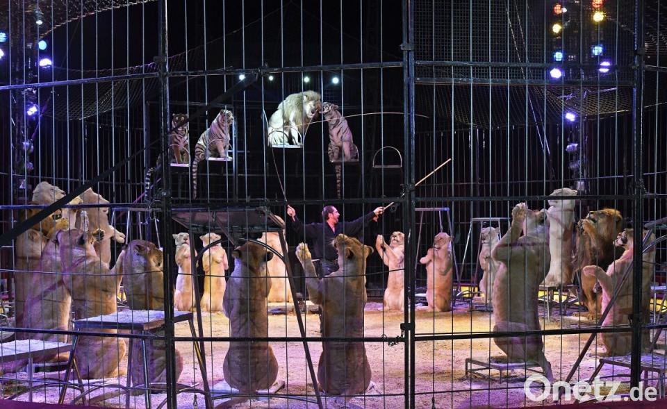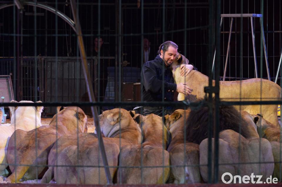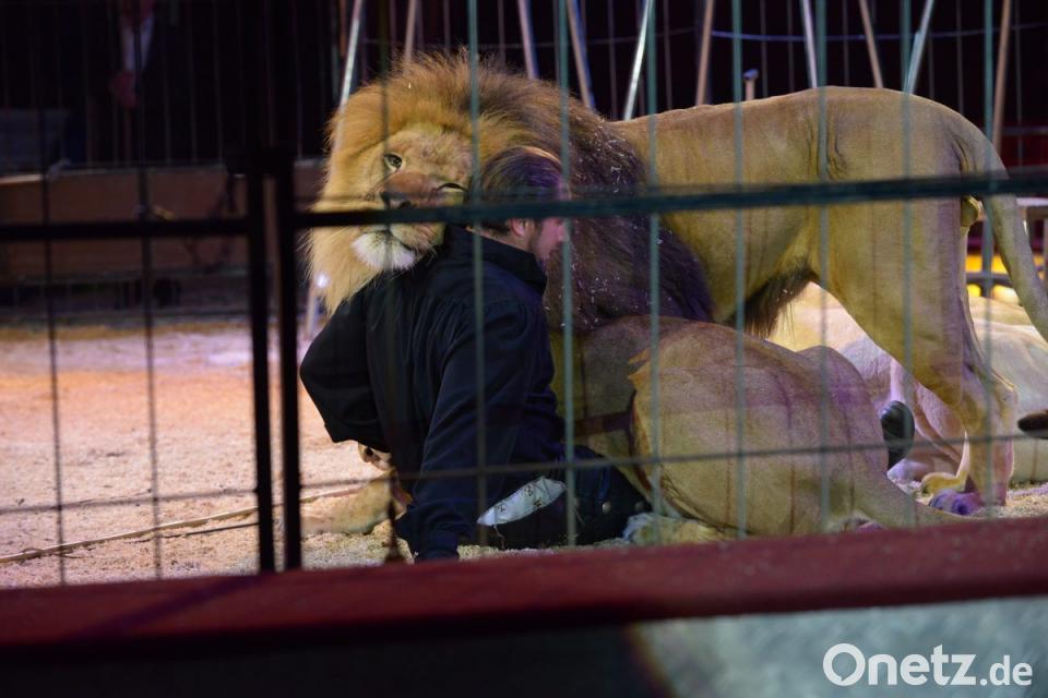 Zweifelsohne die größten tierischen Stars sind die weißen und beigen Löwen und Tiger, die Martin Lacey jr. im Zentralkäfig präsentiert. Er lässt sie gefährlich fauchen und Scheinangriffe ausführen, er schmust und kuschelt mit ihnen. Höhepunkt der Nummer mit der größten gemischten Raubtiergruppe der Welt ist aber, wenn 20 Löwen zeitgleich hochsitzend zu sehen sind. Das gelang Lacey mit seinen Schützlingen in Monte Carlo, das gelingt ihm auch in Sulzbach-Rosenberg.