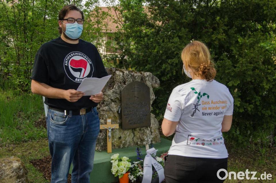 Zu Ehren der in Sulzbach-Rosenberg beerdigten Kriegsgefangenen legte der Verein am Freitag Blumen am Grabstein nieder. Nach einem Grußwort von Christoph Orendi (PunK e.V.) rezitierte Veit Stephan ein Gedicht des anarchistisch-sozialistischen Schriftstellers David Luschnat. Nach einer Schweigeminute für alle, die im Zweiten Weltkrieg im Kampf gegen den Faschismus ihr Leben ließen, sangen die Versammelten abschließend zum Gedenken an die Opfer des Nationalsozialismus gemeinsam das "Moorsoldaten-Lied" von Johann Esser und Wolfgang Langhoff, das bis heute als Hymne des NS-Widerstands gilt.