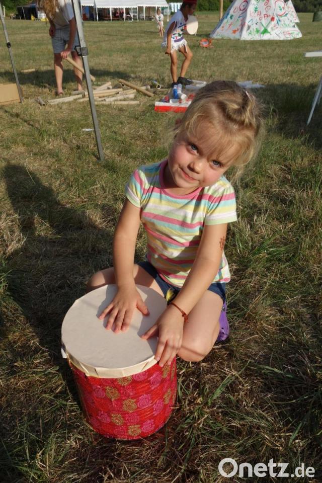Der Workshop-Tag brachte viel Arbeit: Trommeln bauen und bemalen, Regenmacher basteln, Federschmuck, Armbänder, Traumfänger, Indianerkleidung mit dem Stammessymbol, Mokassins, Tipi-Bemalung und Totempfahl-Verzierung leiteten über zum abendlichen Highlight: Der Wolfs-Experte Eckhard Schwedhelm beeindruckte bei einem Freilicht-Beamer-Vortrag mit Szenen und Bildern von Wölfen, die er selbst aufgezogen und beobachtet hatte.