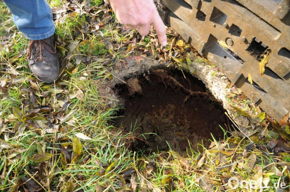 Der eigentliche Bau ist an der Uferböschung, aber weiter oben am Spazierweg tat sich durch die "Erdarbeiten" ein tiefes Loch auf: Am Rosenbach bei Unterschwaig hat der Biber für Verkehrsgefährdung gesorgt. Ein Spaziergänger entdeckte die metertiefe Höhle unterm Weg, Biberbeauftragter Johannes Pirner sah sich die Sache an, der städtische Bauhof sorgte mit einer eingebauten Baustahlmatte und Verfüllung dafür, dass sich der Biber künftig an seinen Bau hält.