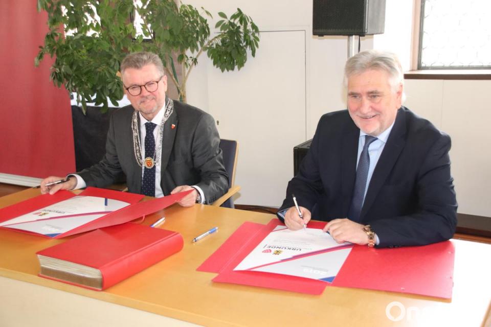 Die beiden Stadtoberhäupter unterzeichneten die Partnerschaftsurkunde, dann trug sich Bertram auch in das Goldene Buch der Stadt ein. Er schrieb: "Auf eine gute, freundschaftliche, gemeinsame Zeit unserer Bürgerinnen und Bürger!"