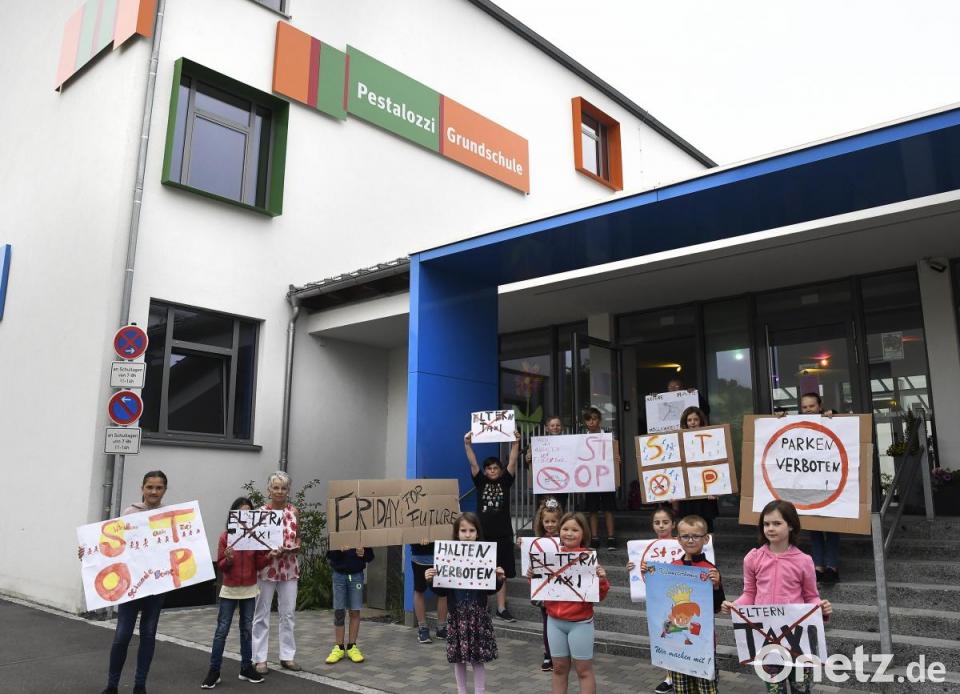 Die Viertklässler haben in der Pestalozzi-Schule die Plakate gebastelt, die die Mädchen und Jungen am Freitagmorgen vor Schulbeginn den Autofahrern entgegenstrecken. "Halten verboten" steht drauf, "Stop - wir haben auch zwei gesunde Beine" oder das durchgestrichene Wort "Elterntaxi". Das haben die Kinder und ihre Rektorin Gunda Köstler nämlich als Gefahrenquelle ausgemacht: dass etliche Eltern ihre Sprösslinge mit dem Auto bis direkt an die Schule bringen.