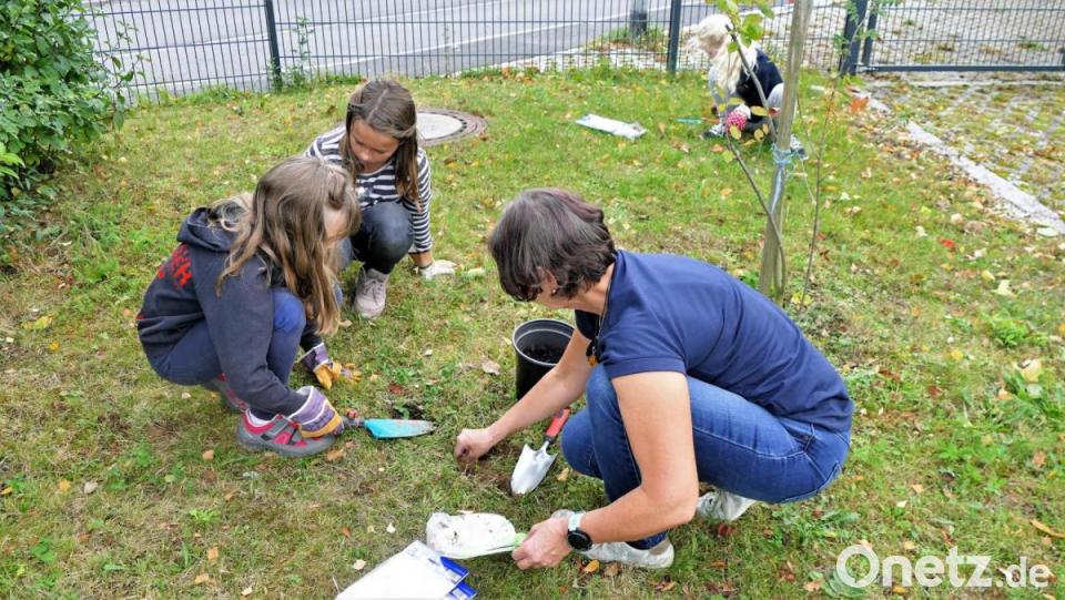 Damit die Bienen auch im nächsten Frühjahr gleich in der Nähe Pollen finden, den sie zur Herstellung ihres Futtersaftes brauchen, startete die AG eine große Pflanzaktion. Über hundert kleine Zwiebeln von Winterlingen, Schneeglöckchen, Krokussen und Wildtulpen wurden rund um die Bienenstöcke von ihnen im Schulgarten eingegraben. Jetzt müssen die Schüler nur noch abwarten, bis es im Frühling dort in allen Farben leuchtet und blüht und die Bienen angelockt werden.