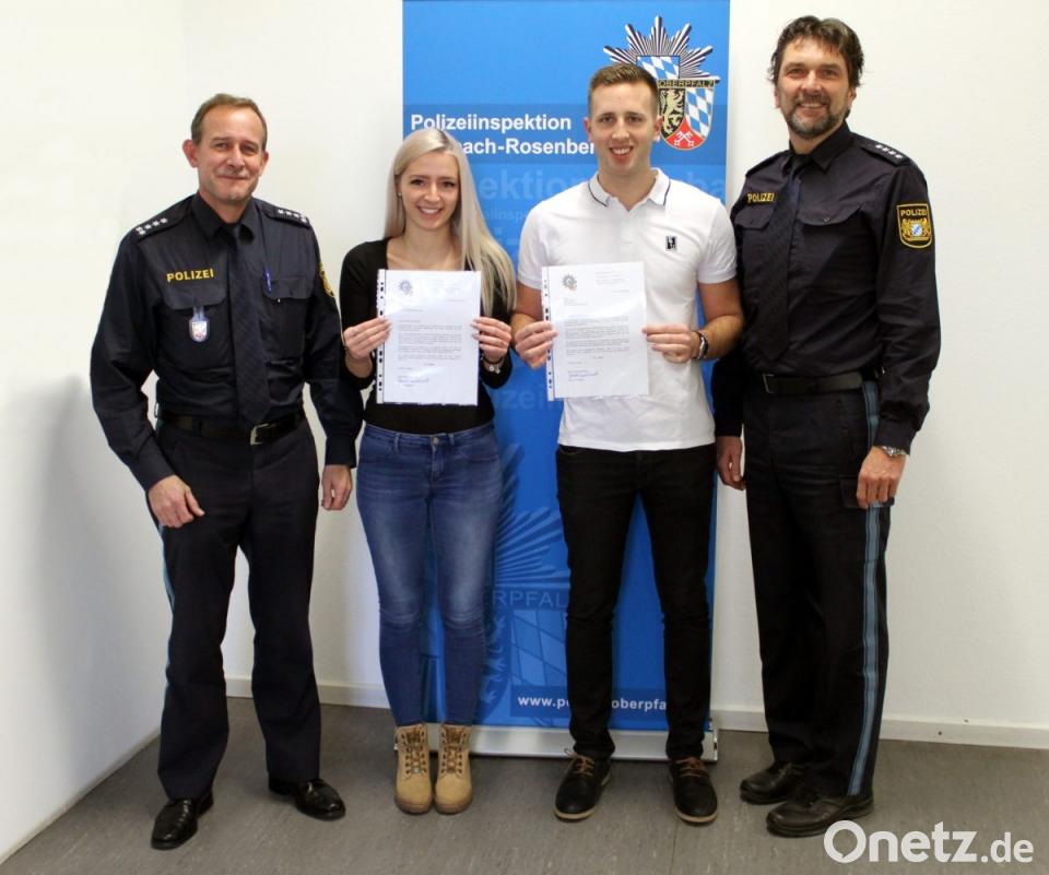 Stellvertretend für den Polizeipräsidenten überreichte der Dienststellenleiter der Polizeiinspektion Sulzbach-Rosenberg, Erster Polizeihauptkommissar Michael Kernebeck das Belobigungsschreiben, das mit einem kleinen Geldpräsent verbunden ist und bedankte sich für das couragierte Einschreiten. Durch dieses vorbildliche Verhalten hofft die Polizei auf Nachahmer in der Bevölkerung, die es dem jungen Paar gleichtun .