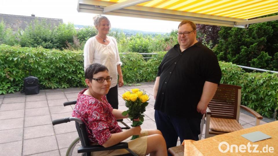 Diplom-Sozialpädagogin Christiane Heigl von der Beratungsstelle Oberpfalz der Deutschen Multiple Sklerose Gesellschaft (DMSG), fuhr aus Regensburg nach Sulzbach-Rosenberg. Dabei hatte sie Rosen für Barbara Kurz und einem Scheck als finanzielle Anerkennung für die Leistung Andreas Hagers.