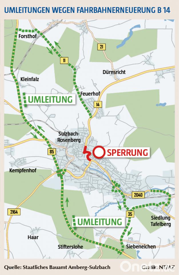 Die an allen Knotenpunkten ausgeschilderten Umleitungen verlaufen folgendermaßen: Für beide Fahrtrichtungen der B 14 über die Kreisstraße AS 11, Gemeindestraße Forsthof, B 85; für den Verkehr der Staatsstraße 2040 über die Sulzbacher Straße, Richard-Strauss-Straße (Maintenon-Brücke), Südstraße, Fromm- und Erzhausstraße, Europastraße (AS 735) und B 85. Bauoberrat Stefan Noll vom Staatlichen Bauamt bittet alle betroffenen Verkehrsteilnehmer, unmittelbaren Anlieger und Anwohner an den Ausweichstrecken um Verständnis für die unvermeidbaren Einschränkungen und Verkehrsbehinderungen.