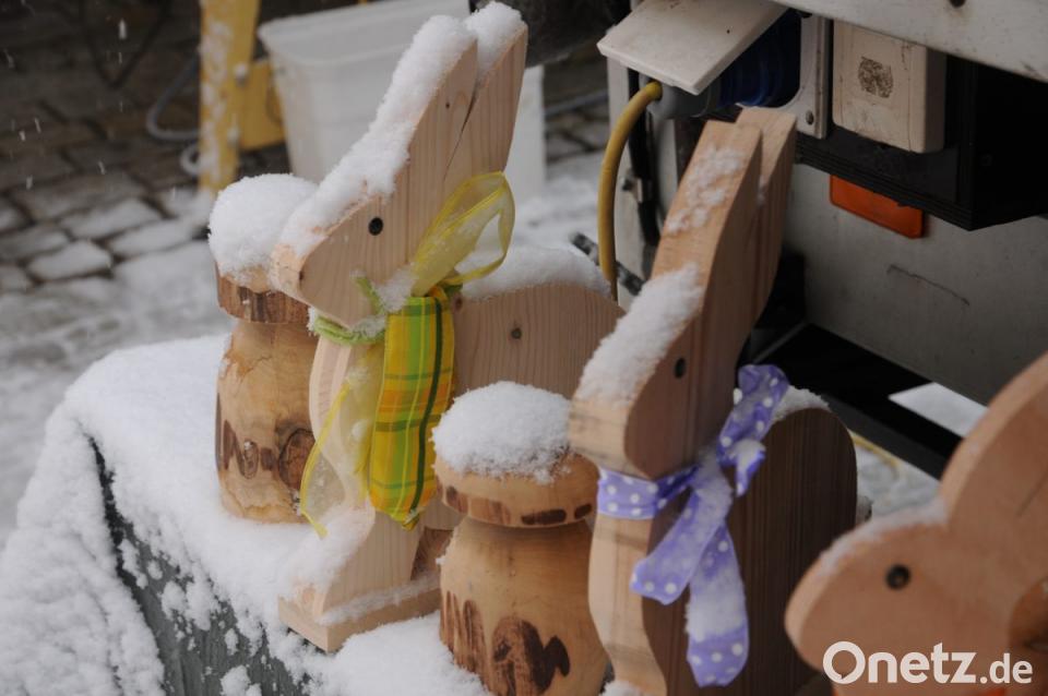 Kotz ist Stammgast auf den Märkten der Umgebung. Alleine in Sulzbach-Rosenberg ist er bis zu viermal im Jahr, auf den Stadtmärkten und auch auf der Hochofen-Plaza. 30 bis 40 Termine nimmt er pro Jahr wahr, seit acht Jahren hat der Pensionär sein Hobby ausgebaut und drechselt vor Publikum seine Produkte. Meist sind es Schalen in jeder Form, aber auch Ostereier, Holzglocken, Vasen und Pilze gehören zu seinem Repertoire. Und eben die mit der Säge ausgeschnittenen Schneehasen. Eigentlich sind es ganz normale Langohren, aber heute haben sie alle eine weiße Haube, genauso wie die Schwammerln daneben. Georg Kotz preist sie lautstark an: "Schneehasen, nur heute im Sonderangebot. Stück normalerweise 12,50 Euro, aber heute gibt's zwei für 26."
