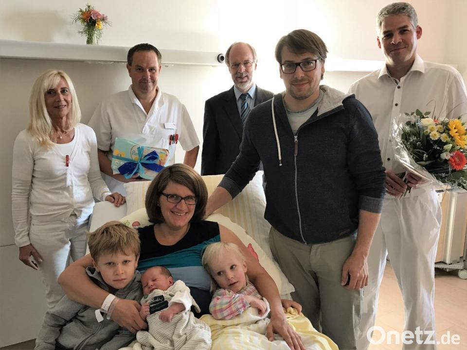 Mehr als eine angenehme Pflicht war es gemäß einer Pressemitteilung des Klinikums für Chefarzt Dr. Sascha Vietoris, Vorstand Klaus Emmerich, Hebamme Gerda Schmidt-Kretschmer, und Stationsleiter Christian Haubner Familie Schmidt zu diesem in doppelter Hinsicht freudigen Ereignis zu gratulieren.