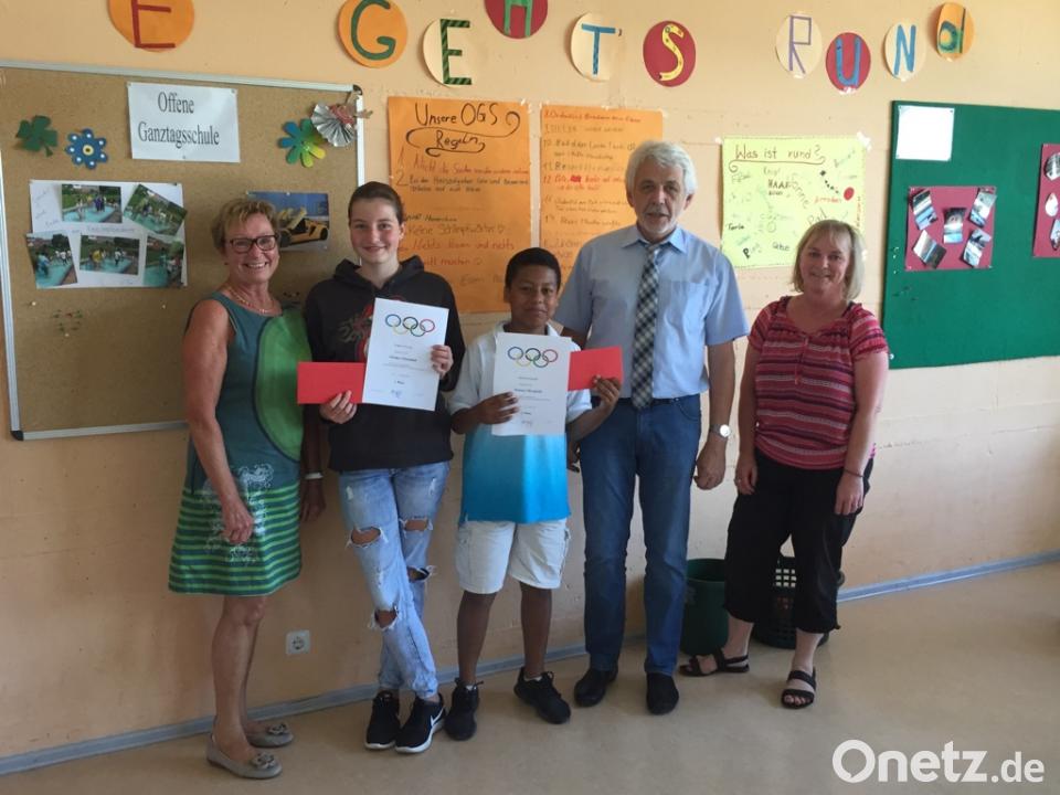 Olympische Ringe auf den Urkunden: Betreuerin Sigrid Luber, die Sieger Elouisa Rother und Gabriel Mallard, Direktor Wolfgang Pfeifer und Gruppenleiterin Christine Mehlhorn (von links) freuten sich bei der Siegerehrung über die gelungene Sommerolympiade der Ganztagsschule an der Walter-Höllerer-Realschule.