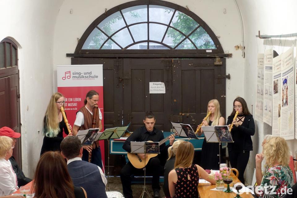 Die Blockflöten der Hofmusik (Felicitas Groth, Annika Haller, Zoe Leach, Emma Löffler und Anna-Lena Schmidt) sowie Hannes Weigert an der Gitarre spielten klangrein, und die Akustik in der Durchfahrt zum Hof, in die man wegen des Wetters umgezogen war, erwies sich als vorteilhaft. Michael Kämmle teilte sein Wissen über das Leben und die Musik am Hofe Ludwig XIV. mit den Zuhörern. So erfuhren diese, dass der königliche Hofkomponist Jean-Baptiste Lully schließlich Ludwigs Privatsekretär wurde und auch in der Politik mitmischte. Er war beim Adel als Emporkömmling verhasst, auch weil er gerne gegen Personen intrigierte, die dem König weniger nahe standen. Sein musikalisches Genie war jedoch allgemein anerkannt, und er gilt als der Erfinder der französischen Oper.