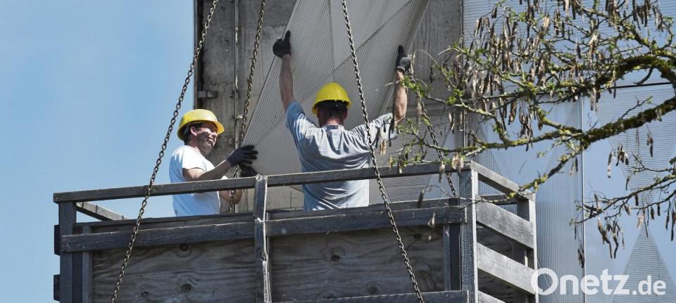 "Alle Platten müssen runter", vermeldete die SRZ schon am Donnerstag mit Verweis auf die Notwendigkeit aus Sicherheitsgründen. Begonnen wurde der Rückbau der Fassade an der Friedhofseite: Dort hat sich der mächtige Autokran der Illschwanger Firma Prosch in Stellung gebracht. Am Haken des fast senkrecht stehenden Auslegers hängt ein Container, in dem zwei Männer von der Edelsfelder Firma Dieter Kohl ihren Job verrichten: Sie lösen die Verankerung der jeweils rund 50 Kilogramm schweren Keramikplatten und wuchten sie in den Korb.