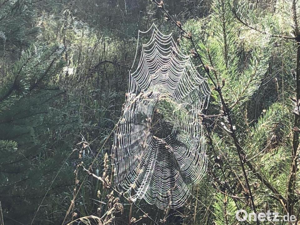 Ein Spaziergang in Wald und Flur kann im Frühherbst so manches schöne Naturerlebnis bieten. Das Netz einer Kreuzspinne beispielsweise, das sich durch den Tau der Nacht im frühen Sonnenlicht deutlich abzeichnet. Dem Volksglauben nach die typische Altweibersommer-Stimmung.