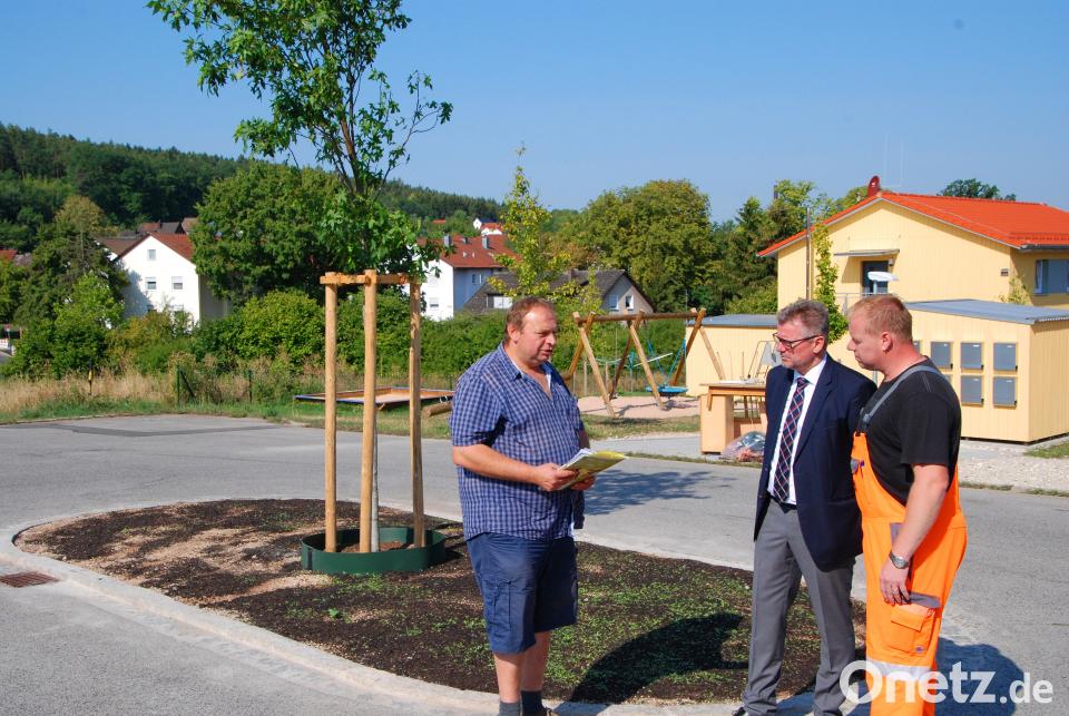 Bei einem Ortstermin mit Bürgermeister Michael Göth stellten Stadtgärtnermeister Klaus Herbst und stellvertretender Bauhofleiter Tobias Bauschke das Stadtteil-Projekt vor.