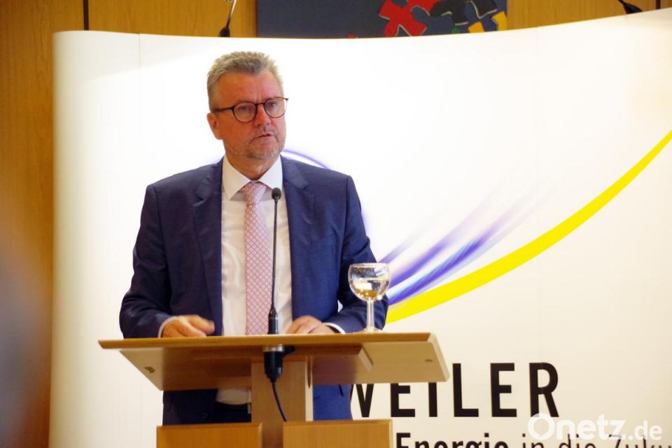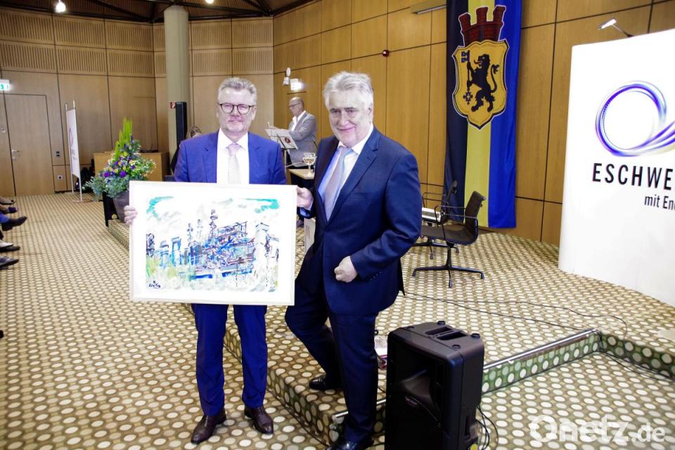 In einem würdevollem Festakt wünschte sich Bürgermeister Bertram für die Zukunft, dass Vereine und die Bevölkerung die Partnerschaft mit regem Leben erfüllen mögen. So werden die bereits in der Herzogstadt geäußerten Wünsche zur Partnerschaft in Eschweiler noch einmal gefestigt. Michael Göth bedankte sich für den überaus freundlichen Empfang in der Karnevalshochburg. Er überbrachte als Geschenk ein Gemälde des MH-Stahlwerks von Kulturpreisträger Hans Wuttig: "Neuer Blick auf die Maxhütte". Im Stahl aus Bayern für die Röhrenwerke in NRW liege die Wurzel der Partnerschaft mit Eschweiler.