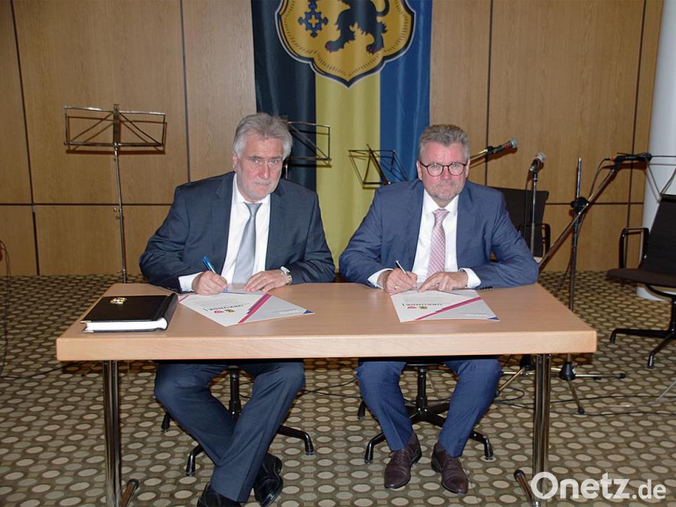 Nach der Unterzeichnung der Partnerschaft in Sulzbach-Rosenberg am 13. April setzten nun beim Gegenbesuch der Oberpfälzer Abordnung die beiden Bürgermeister Rudi Bertram und Michael Göth ihre Unterschriften auf die Urkunden in Eschweiler.