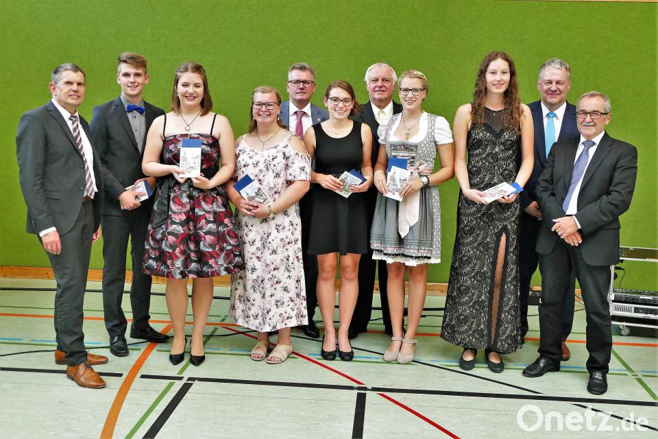 Am Herzog-Christian-August-Gymnasium erhielten am Freitag 96 Abiturienten ihr Reifezeugnis. Dabei freute sich Schulleiter Dieter Meyer (links) und Studiendirektor Ludwig Räß (rechts), der als Oberstufenkoordinator die Schülerinnen und Schüler die letzten zwei Jahre betreut hatte, über die erreichten Leistungen und Ergebnisse. Bei einer beeindruckenden Feierstunde wurden für ihr hervorragendes Gesamtergebnis besonders geehrt: Von links Uli Utz (1,2), Greta Kick (1,3), Lea Stark, Sarah Jelinski, Pia Schall und Kirsten Schulze (alle 1,4). Zu den ersten Gratulanten gehörten Bürgermeister Michael Göth (Fünfter von links) der ständige Vertreter des Schulleiters Helmut Schneider (Siebter von links) sowie Landrat Richard Reisinger (Zweiter von rechts).