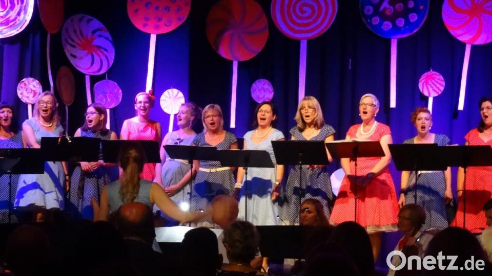 Auf der mit überdimensionalen Lollipops dekorierten Bühne agierten sie in bunten Tupfenkleidern mit Petticoats, wippenden Röcken und Perlen um den Hals, so wie es halt Mode war in der Mitte des vorigen Jahrhunderts. Die Lieder des Chores wurden unterstützt von Paul Färber am Klavier und teilweise begleitet von einem kleinen Streichensemble von sieben Musikern sowie Daniel Zacher am Akkordeon. Vorgestellt wurden alle Stücke von der Chorleiterin. Ulrike Straub zeigte humorvoll deren Entstehungsgeschichte auf, plauderte über die Interpreten und die Zeit, in der sie "auf Platten für fünf Mark" zu kaufen waren.