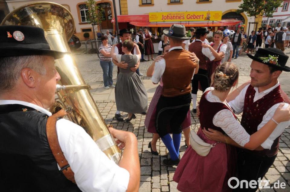 Der Sonntag sah dann zunächst den traditionellen Kirwagottesdienst in der Pfarrkirche St. Marien, allerdings fiel der vormittägliche Frühschoppen mit den üblichen „Sauernen“ fast komplett dem starken Regen zum Opfer. Doch mittags klarte es wieder auf, es machte sich allmählich Aufbruchstimmung breit: Die Kirwaboum pilgerten bergab zum Pamler und ließen es sich in der „Landkutsche“ gut gehen, während ihre Moila sich zum Sekttrinken in diverse Lokalitäten der Innenstadt zurückzogen. Die Sehnsucht wurde dann aber doch so groß, dass sich der ganze Trupp der Boum zur Fahndung aufmachte und die Moila aus den Wirtshäusern auslöste. Deftige Tänze umrahmten die erfolgreiche Suchaktion, bis der Höhepunkt unausweichlich war: Gegen 16 Uhr erschien der Zug der Kirwaleit, begleitet von Musik und Bätzn, wieder am Luitpoldplatz, die Akteure erklommen das Podium.