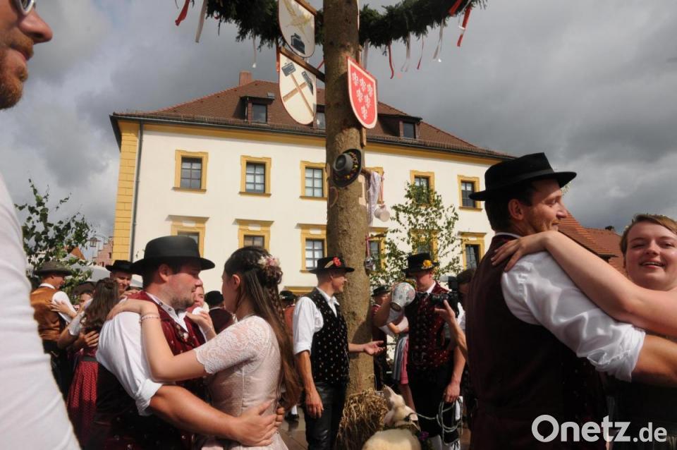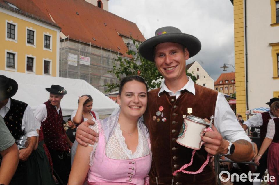 Nach fast 40 Minuten eifrigen Tanzes rund um den prächtigen Kirwabaum entschied der Wecker: Lena Reichenberger und Benedikt Niebler sind das neue Oberkirwapaar der Woizkirwa 2024. Damit trat der nicht so häufige Fall ein, dass beide Vereine im Spitzen-Duo vertreten sind, denn Lena kommt aus dem Stamm-Verein, und Benedikt ist ein Birgländer. Überglücklich schmückten sie sich gegenseitig mit den Insignien ihrer Würde, als da sind Hut, Bierkrug und Tuch, und dann nahmen sie die Glückwünsche der sie begeistert bejubelnden Kolleginnen und Kollegen entgegen.