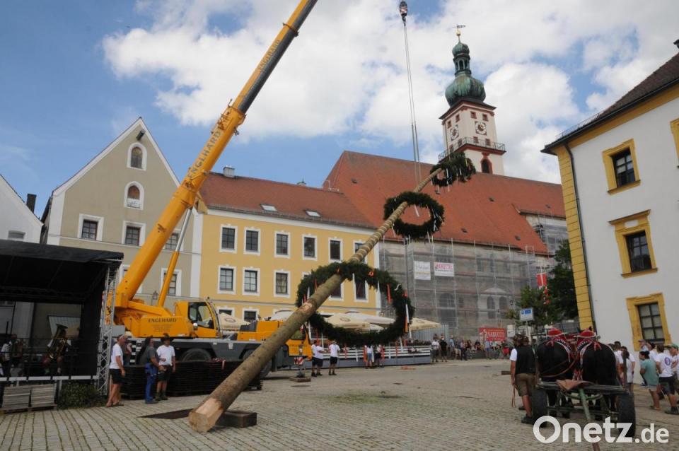 Am Kirwabaum-Loch angekommen, übernahm ein Spezialist der Firma Englhard mit einem riesigen Autokran die Aufgabe, den 33-Meter-Riesen in die Senkrechte zu bugsieren. Nachdem die vorbereiteten drei Kränze montiert waren, schwebte der komplette Baum mit seinen rund zwei Tonnen Gewicht hübsch langsam an seinen Platz und wurde von den Boum flugs fachkundig fixiert. Den Stammboden zieren sechs Fuchsbeck-Kronenkorken. Er wird nun für die nächsten Wochen im Namen der Woizkirwa weit hinaus ins Land grüßen. Podium und Bänke folgten, die Musik hatte schon zum Aufstellen gespielt, und dann ging es in die erste Kirwanacht hinein, in der die Organisatoren vom Stamm und vom Heimatverein Birgland es den Gästen wie immer an nichts fehlen ließen - auch die Temperaturen erwiesen sich als relativ moderat.