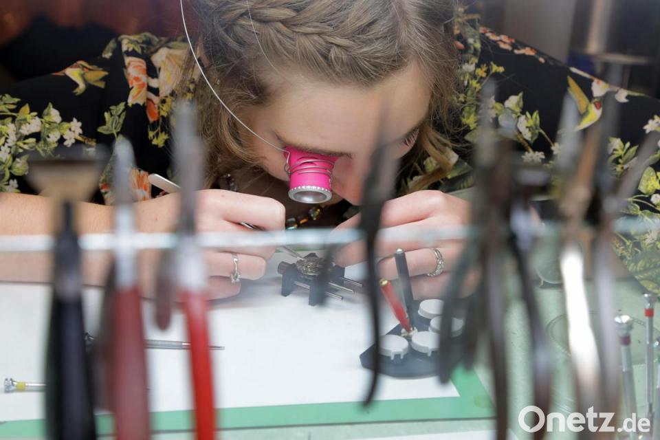 Als die Realschülerin nach einem Praktikum verkündete, sie wolle beim Papa in die Lehre gehen, war die Freude groß. Und so sitzt sie jetzt tagtäglich mit der Lupe an ihrem Arbeitsplatz und lernt die Grundbegriffe und Standard-Übungen des Handwerks. Nun, im zweiten Lehrjahr, beherrscht die 17-Jährige schon viele Fertigkeiten. Für Grobmotoriker ist dieser Beruf eher nichts: Muss etwas eingepasst werden, geht es beim Feilen schon mal um einen Hundertstel Millimeter. Da ist Geduld gefragt und Augenmaß.