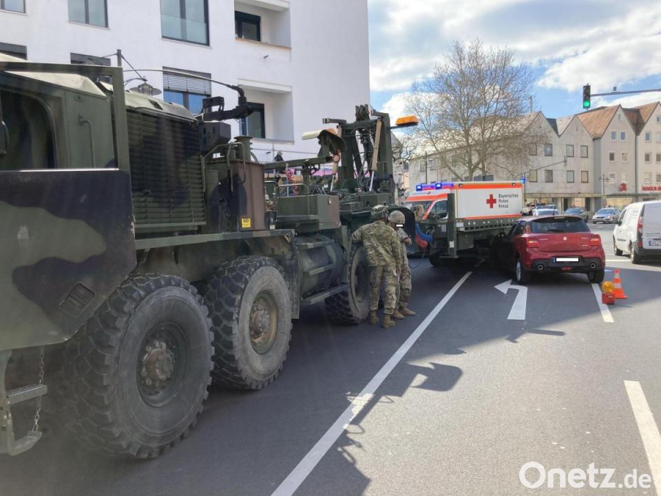 Der Anhänger des Schwerlastgespanns schob sich dabei über die Motorhaube des Suzuki Swift der Frau. Mehrere neugierige Passanten betrachteten das Spektakel, die Kreuzung war blockiert, die Polizei regelte den Verkehr. Verletzt wurde bei dem Unfall niemand. Der Schaden beläuft sich auf etwa 10.500 Euro. Während der massiv gebaute Militärlaster den Zusammenstoß nahezu unbeschädigt überstanden hatte, blieb am Kleinwagen ein "massiver Frontschaden" zurück. Das Auto sei trotzdem noch fahrtüchtig gewesen, die Besitzerin habe sich selbst um die Abholung gekümmert. In die Unfallermittlungen wurde auch die US-Militärpolizei aus Vilseck einbezogen.