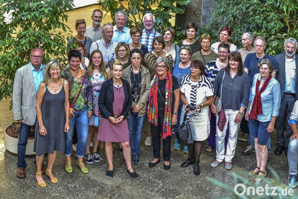 Die kreativen Kursteilnehmer mit ihren Dozentinnen Nora Matocza (Zweite von links), Uschi Schönberger (mittlere Reihe, Dritte von rechts) und Bettina Hirsch-Uwer (hinten, Vierte von rechts), VHS-Leiter Manfred Lehner (rechts) sowie Bürgermeister und Kreisrat Hans-Jürgen Reitzenstein (links).