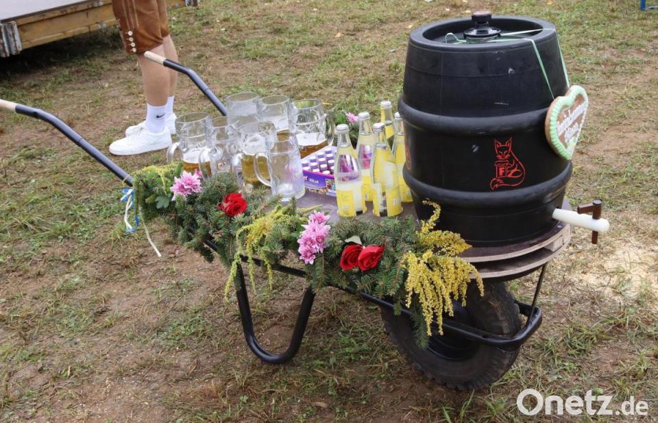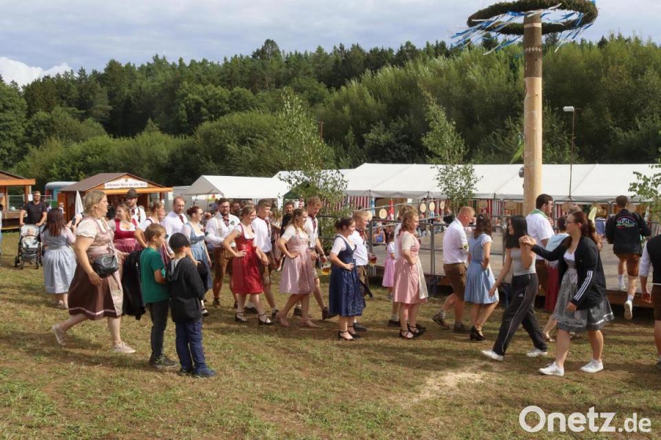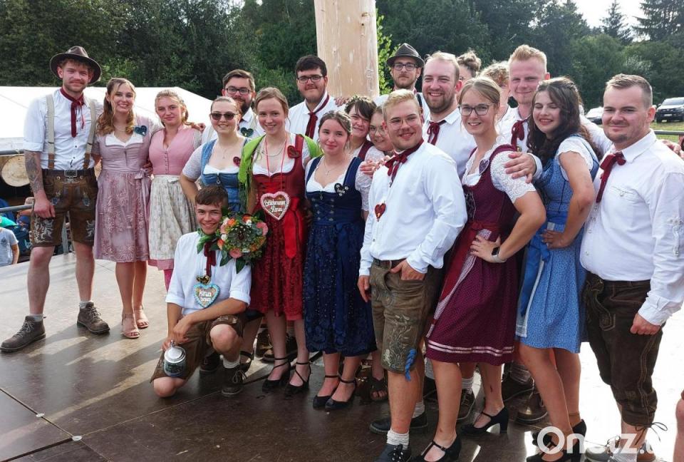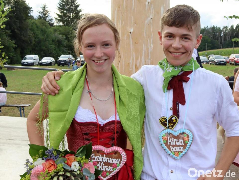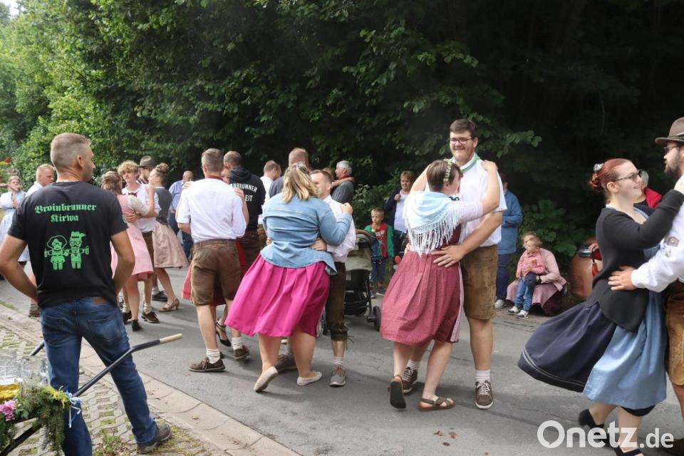 Mittlerweile scharten sich am Kirwaplatz die Besucher, denn der vormittags noch regnerische Himmel hatte aufgeklart. Wecker und die Insignien für das Oberkirwapaar hingen am Baum. Dass Zeit ein sehr dehnbarer Begriff sein kann, wurde in der nachfolgenden Stunde deutlich. Der Wecker wollte nicht läuten. Sogar die Organisatoren wurden langsam unruhig. Tapfer tanzten die Kirwa-Paare, reichten den Blumenstrauß weiter, und ließen immer wieder mit rauen Stimmen die Frage über den Platz schallen: "Wer hout Kirwa?" Irgendwann besann sich der Wecker dann doch seiner Hauptaufgabe, läutete und machte damit Amelie Högner und Jonathan Neumüller zum Oberkirwapaar. Die Freude war groß und derart überschäumend, dass unter den Luftsprüngen der Kirwagemeinschaft eine Bühnenplatte brach. Die Kirwapaare nahmen es zur Kenntnis, marschierten mit Musik in die Bar zur "8. Quelle" und waren lange nicht mehr zu sehen. Die „6 lustigen 5“ bestimmten mit traditioneller und moderner Blasmusik am Abend das Geschehen auf der Bühne im Zelt.