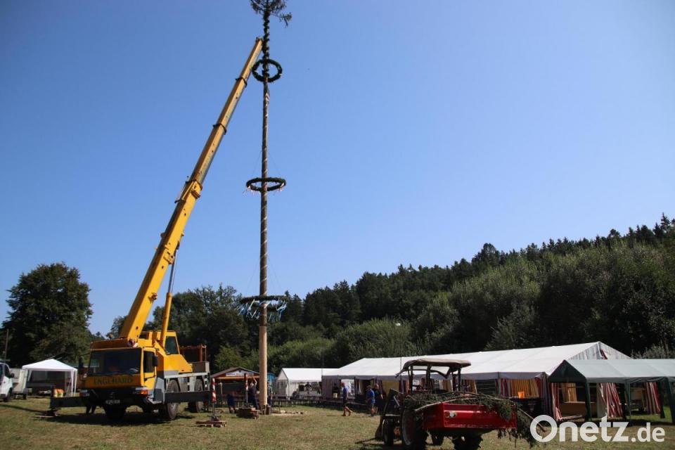 Die Frische des Morgens nutzten die "Broinbrunner" am Samstag, um einen Baum zu schlagen. Schnell kletterte das Thermometer am Vormittag nach oben. Sowohl die Hitzegrade als auch die Höhe des Kirwa-Wahrzeichens wurden am frühen Nachmittag mit "mehr als 30" angegeben. Das Aufrichten des Baumes erleichterte ein Kran. Das Einschlagen der Sicherungspfähle war in der sengenden Sonne eine schweißtreibende Arbeit, die aber letztlich auf viele helfende Hände aufgeteilt wurde. Für die Studentin Maja, als Kirwa-Moidl in Breitenbrunn zum ersten Mal dabei, war das trotz der Hitze eine willkommene Abwechslung.