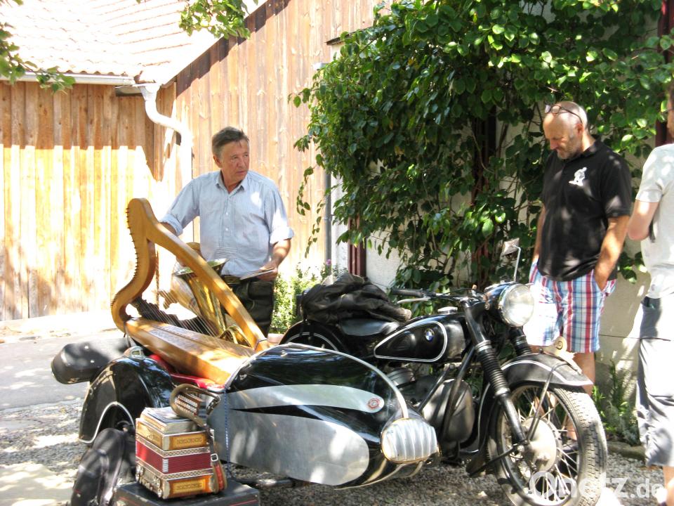 Georg Leugner-Gradl vom Steinlinger Balg durfte am Montag einen interessanten Besucher in seiner "Quetschn"-Werkstatt begrüßen: Stofferl Well auf dem Motorrad-Oldtimer mit einem Beiwagen voller Instrumente hielt Einkehr in der Werkstatt. "Mei Ziach brauchad amal das Richten", stellte er sich vor. Mit dabei hatte er ein Aufnahmeteam vom Bayerischen Rundfunk.
