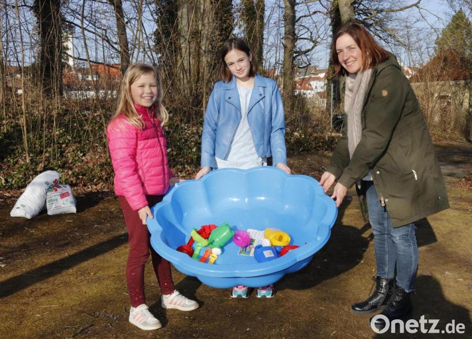 Lena (links) und Lenya übergeben die Sandkästen und Sandspielsachen für die Kinder in der Flüchtlingsunterkunft am Beruflichen Schulzentrum Sulzbach-Rosenberg an Sandra Falk. Sie ist die Kontaktperson der Schule zu den Flüchtlingen und versprach den beiden Mädels, ihre Sachspende den Flüchtlingskindern zu übergeben.