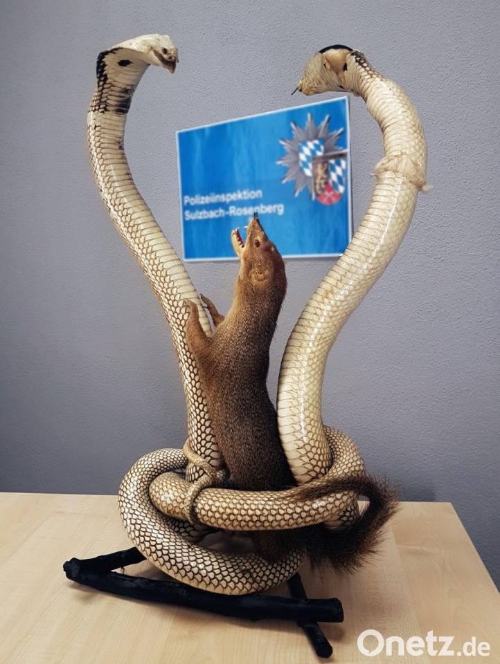 Nach Angaben von stellvertretendem Dienststellenleiter Polizeihauptkommissar Peter Krämer musste nun nur noch die Identität des 18-jährigen Herzogstädters festgestellt werden. Dazu fuhren die Ordnungshüter zur Wohnung, um dies zu überprüfen. Im Eingangsbereich sprangen ihnen aber sogleich zwei ausgestopfte Reptilien, die sich im Kampf mit einem Mungo befanden, sprichwörtlich entgegen. Die beiden Kobras waren auf einem Gestell drapiert, und wohl schon etwas in die Jahre gekommen.