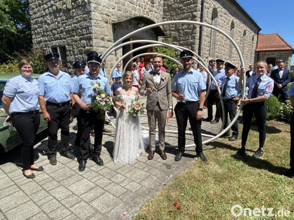 Nachdem Sebastian, einer der Chefs der Öko-Ranch in Pfreimd, neben seiner Leidenschaft für Oldtimer aktives Mitglied der Feuerwehr Kleinschwand ist, musste er auch mit seiner Braut durch eine von den Feuerwehrkameraden aufgestellte Schlauchspirale gehen. Belohnt wurden beide mit einem kühlen Glas Sekt.