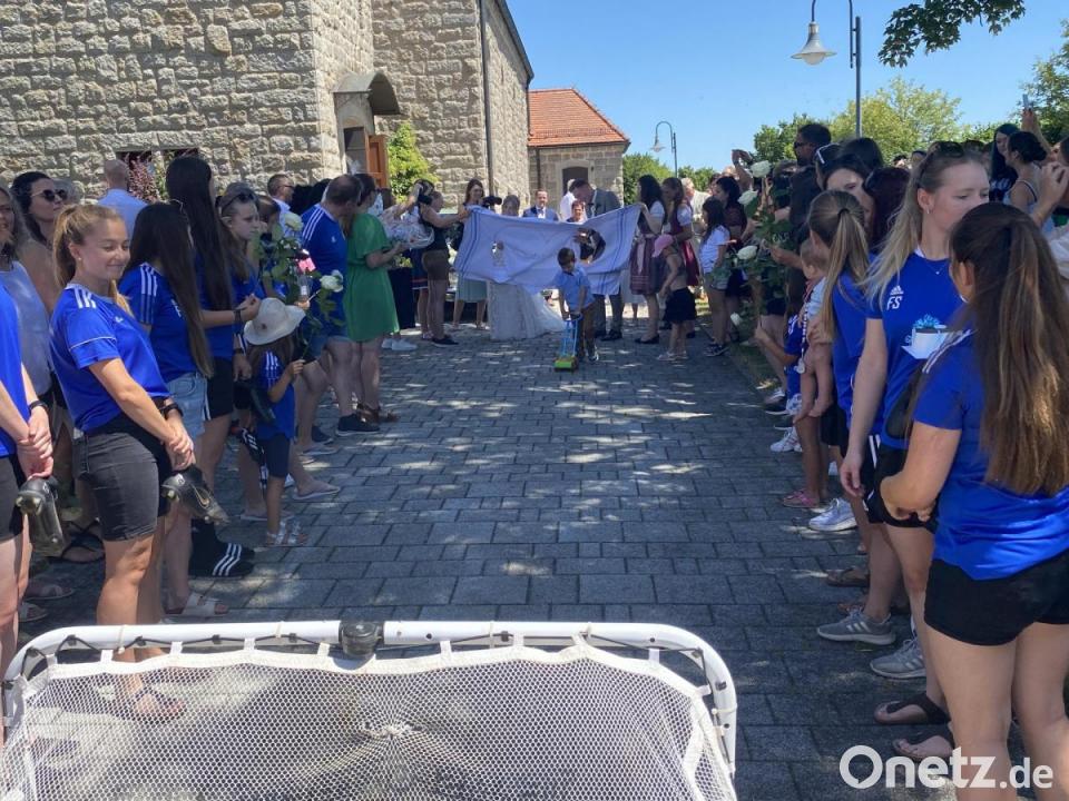 Wie sie ihre Trainerin schätzen, bewiesen die C-Juniorinnen vom SV Altenstadt, wo die Braut mehrere Jahre in der Damenmannschaft gespielt hat. Die gesamte Mannschaft war angetreten und bildete mit ihren „Fußballtretern“ ein Spalier. Den fälligen Freistoß brachte Katharina zielsicher im Tor unter.
