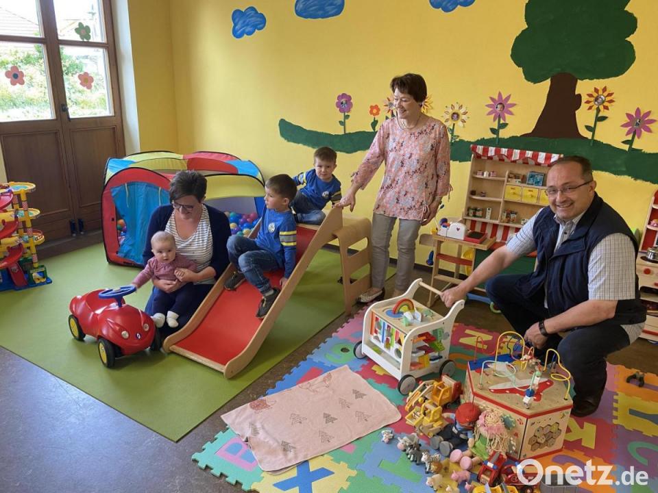 Eine große Freude machte der Markt und die Pfarrei Tännesberg der Krabbelgruppe. Gerne unterstützt die Gemeinde laut Bürgermeister Ludwig Gürtler diese Einrichtung und übernahm daher die Kosten für die neuen Spielgeräte. In die gleiche Kerbe schlug Gerti Braun, Sprecherin des Pfarrgemeinderates, der eine spezielle Matte finanzierte.
