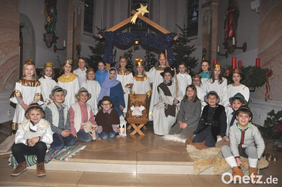 Die Hirten auf dem Feld deuteten die Aufregung ihrer Schafe damit, dass etwas Besonderes geschehen sein müsse. Ein Engel sprach von der Kanzel zu ihnen: "Fürchtet euch nicht, denn heute ist euch der Retter, der Heiland, geboren. Ich führe euch zu dem Ort." Die Hirten wollten nicht glauben, dass dieser in einem Stall geboren worden war. Doch Maria sagte zu ihnen: "Ja, Gott selbst ist Mensch geworden in dieser Nacht. Er hat in Jesus helles Licht in die dunkle Welt gebracht." Die Hirten und eine große Schar Engel knieten vor der Krippe nieder. Evi Demleitner an der Orgel begleitete schließlich das Weihnachtslied "Stille Nacht".