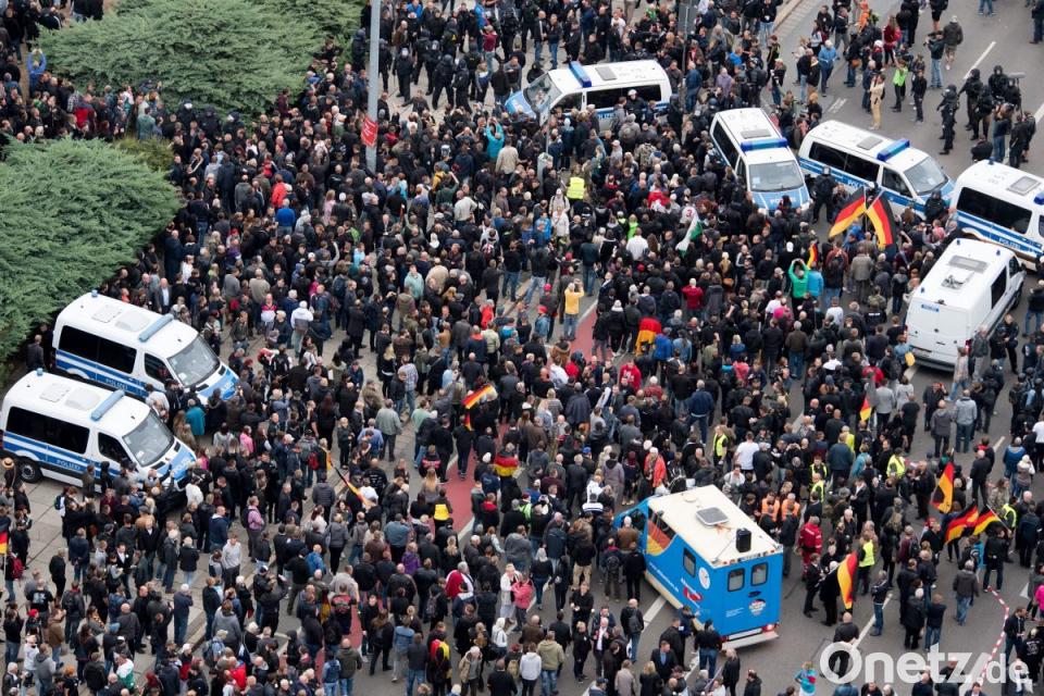 Mit zunehmender Dauer der Veranstaltungen wurde die Stimmung in der Stadt angespannter. Der Zug mit rechten Demonstranten kam am frühen Abend nur stockend voran. Nach einem verspäteten Start wurde der Marsch kurz vor dem Denkmal mit dem Karl-Marx-Kopf wieder gestoppt und schließlich unter lautstarkem Protest abgebrochen. Wasserwerfer fuhren auf. Polizei und zahlreiche Demonstrationsteilnehmer standen sich auch nach Abbruch der Veranstaltung angespannt gegenüber.