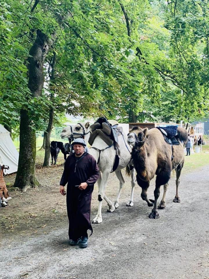 "Um euch zu erheitern haben wir Kamele, Alpakas, Ziegen Schafe, Drachen, Märchenerzähler, Spielleut und Tänzerinnen aus nah und fern organisiert. Ebenso hölzerne Riesenräder, Bogenschießen, Flaggendrucken und vieles mehr."