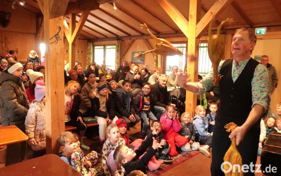 Die Feier zur Einweihung des Funktionsgebäudes und der Parkplätze wurde wegen des schlechten Wetters ins "Wedahaisl" verlegt. Pfarrerin Hanna Fiedler-Stahl und Pfarrer Lucas Lobmeier segneten den neuen Empfangsbereich, in den der Landkreis knapp 1,5 Millionen Euro investierte. Vor den Toren des Wildgeheges entstand ein Parkplatz mit 200 Stellplätzen. Sepp Schabernack, alias Josef Fischer aus Schwarzenfeld, begeisterte die Besucher mit einer bunten Mischung aus Jonglage, Artistik und Zauberei. Passend zum Spielort ließ der Clown die Hühner tanzen und Saltos schlagen (Bild). Die Familien starteten anschließend zur "Hölli-Rallye" durch das Gelände und suchten nach Anworten auf die Fragen im Flyer, etwa: Wie heißt der Storch im Märchen? Zum Rahmenprogramm des Familienfestes gehörten neben der Clownshow auch der Auftritt des Musik-Duos "Schmarrnkerl und Funkerl", Verkaufsstände mit Kunsthandwerk, ein Tattoo-Studio und eine Tombola.
