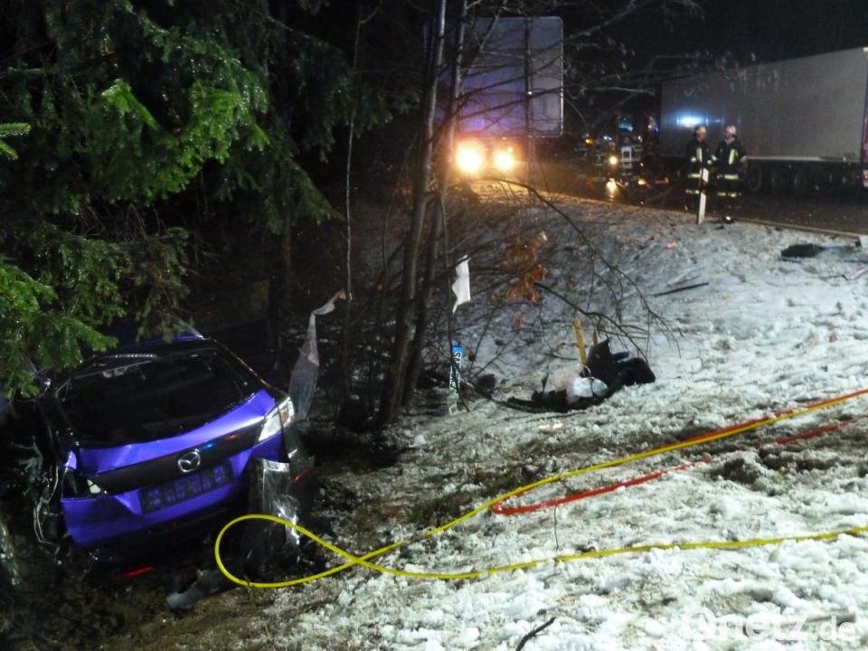 Nach längerer Pause hat es wieder einmal an der Teunzer Kreuzung gekracht. Blinkendes Blaulicht und ein großräumig ausgeleuchteter Bereich deuteten kurz nach 18 Uhr schon von weiten auf einen Unfall hin. Laut Angaben der Polizeibeamten vor Ort, war dafür ein 39-Jähriger aus Schwandorf verantwortlich, der mit seinem blauen Mazda die Bundesstraße 22, auf der Staatsstraße 2156 von Nabburg kommend, überqueren wollte. Trotz Stopp-Schild am Fuße des Berges, fuhr er laut Zeugen ungebremst in Richtung Teunz über die Kreuzung und krachte in die rechte Frontseite eines Sattelschleppers, der von Tännesberg in Richtung Oberviechtach unterwegs war. Während der Lkw auf der Fahrbahn zum Stehen kam, schlitterte der Pkw die Böschung an der Einfahrt nach Teunz hinunter und blieb im Gebüsch oberhalb eines kleinen Bachlaufes stecken.Der Fahrer und sein 45-jähriger Beifahrer wurden im Fahrzeug eingeklemmt.