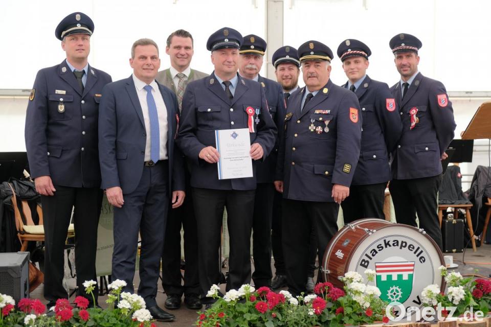Das Feuerwehrfest in Zeinried nutzten Kreisbrandrat Robert Heinfling, Kreisbrandinspektor Richard Fleck und das Vorstandsgremium der Feuerwehr Zeinried mit dem Vorsitzenden Stefan Bauer, um Peter Breitschafter ein herzliches Vergelt's Gott zu sagen. Breitschafter, der bereits als Vorstand in der Feuerwehr Zeinried aktiv war, hatte sich bereit erklärt, den Festausschuss zu leiten und die Festleitung für das 125-jährige Gründungsjubiläum zu übernehmen. Für dieses herausragende Engagement wurde ihm die silberne Ehrennadel des Kreisfeuerwehrverbands Schwandorf überreicht.