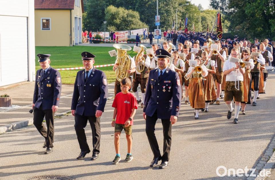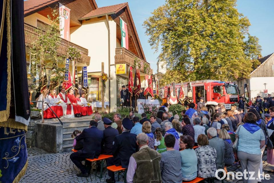 Schon der Kirchenzug am Samstagabend zeigte, dass die Feuerwehr Teunz nicht nur bei den Einsätzen professionell vorgeht, sondern auch beim Feiern. Fast 50 Feuerwehren aus der Region und Vereine aus der Gemeinde marschierten nach einem donnernden Salut der Pirkhofer Böllerschützen auf den Dorfplatz ein. Der Gartenbauverein hatte zusammen mit der Familie Biersl und den Mesnern den Altarbereich vorbereitet. Zusammen mit dem geschmückten Feuerwehrauto unter dem Kastanienbaum - sowie mit Murach, Maibaum und Kirche im Hintergrund - war ein wunderbarer Rahmen für den Gottesdienst im Herzen des Dorfes geschaffen. Die Blaskapelle Teunz umrahmte den Gottesdienst musikalisch, der von Pfarrer Herbert Rösl und Pfarrer Michael Saller gemeinsam zelebriert wurde.