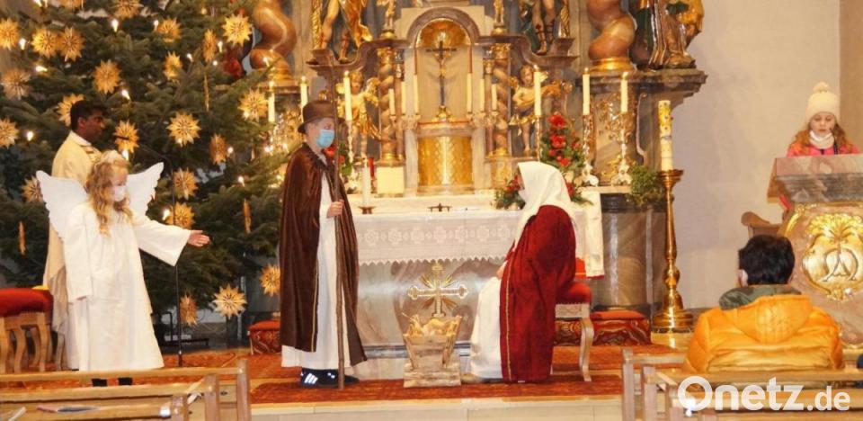 "Heute ist ein Tag, auf den alle schon lange gewartet haben und alles vorbereitet haben", begrüßte Pater Savari Selvarasu die Eltern, die mit ihren Kindern zu dem Wortgottesdienst gekommen waren. Das traditionelle Krippenspiel wurde von den vier Kindern der Familie Scheuerer, Mia, Michaela, Sarah und Andreas, vorgetragen. Nachdem Maria und Josef durch den Mittelgang zum Altar eingezogen waren, wurde die Weihnachtsgeschichte nach dem Evangelisten Lukas vorgetragen. Anschließend sang der Pater einige Strophen des Liedes "A Christ ist born" auf Englisch und Deutsch.