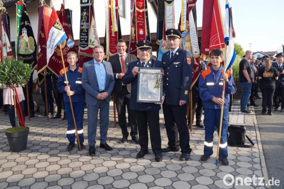 Nach einem kleinen Standkonzert wurden Geschenke überreicht, darunter auch ein "Ehrendiplom" für Richard Fleck und Blumen für Gattin Anita anlässlich des 44. Hochzeitstages, der ebenfalls an diesem Tag gefeiert werden konnte. "Das ist der Wahnsinn, ich bin den Tränen nahe und total überrascht von der großen Zahl an Teilnehmern", meinte Fleck sichtlich gerührt. Dass der Landrat einmal in seinem Hof stehen werde, hätte er nicht gedacht. "Ich habe in all den Jahren nur Freunde und gute Kameraden erlebt, auch unter der Führungsriege", so Fleck. Bezüglich des Heranwachsens der Feuerwehrjugend, seinem "Steckenpferd", und deren Engagement bei Führungsaufgaben, meinte er: "Da wird es mir um die Zukunft der Feuerwehr nicht bange." Nach dem Festakt waren alle auf der abgesperrten Straße zu Bratwurstsemmel und Getränken eingeladen.