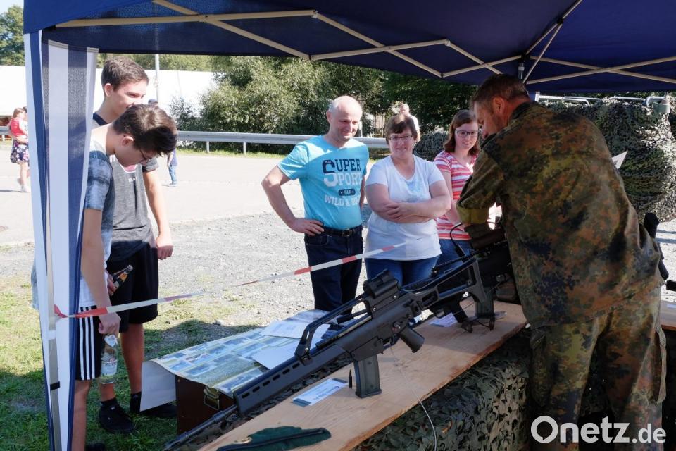 Die modernen Waffen der Bundeswehr waren ein Besuchermagnet. Das Ausproberen und Begreifen der verschiedenen Gegenstände der Einsatzausrüstung führte auch mit den Kindern zu netten Gesprächen.