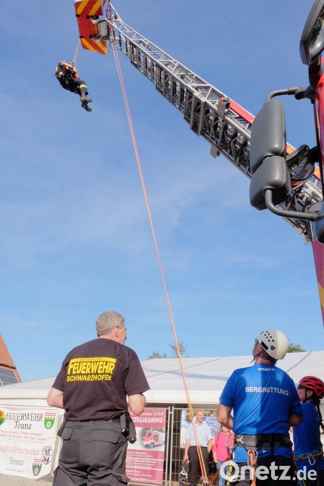 Auf großes Interesse stießen die Vorführungen der Rettungshundestaffel. Die Retter auf vier Pfoten führten im Hindernis-Parcours und beim Abseilen von der Drehleiter die Zusammenarbeit von Mensch und Tier vor. Für die Kinder war mit Hüpfburg, dem Spielmobil des Kreisjugendrings, dem Kinderschminken und RC-Truck-Fahren gesorgt. Zur Freude der Veranstalter füllte sich das Festzelt gut. Zur Blasmusik der Blaskapelle Teunz genossen die Gäste einen gemütlichen Nachmittag.